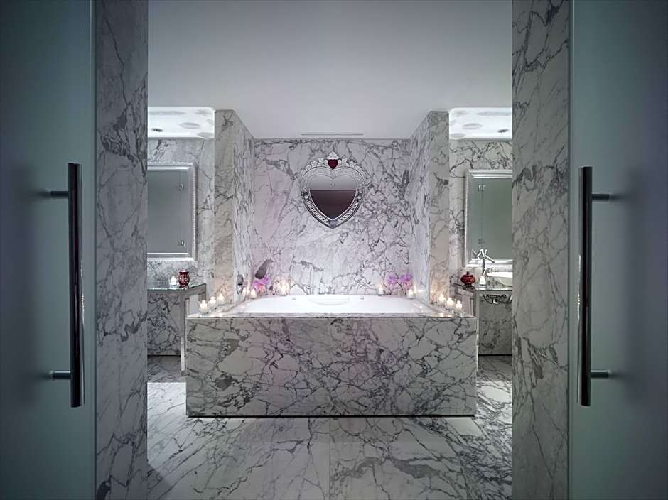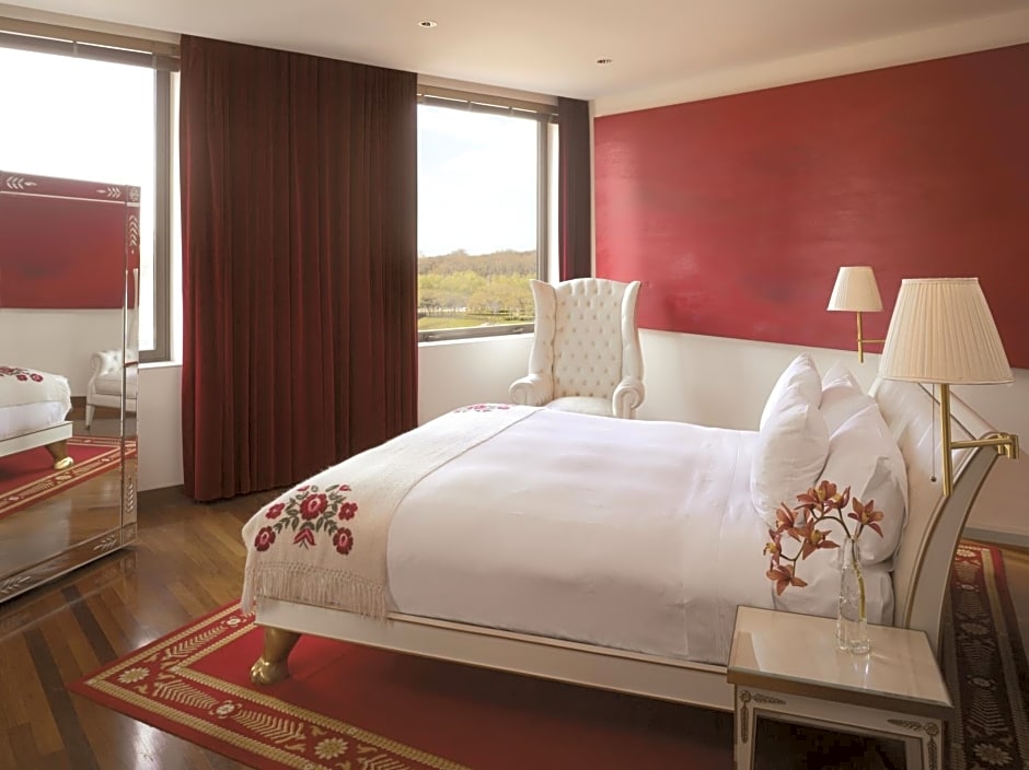 Located on the 1st floor, this split-level suite features a spectacular view of the city skyline and beautiful treetops. This comfortable and elegant suite has a living room with a red velvet sofa, a matching rug and sophisticated furniture. It also has a bathroom with marble floors, a bathtub and a separate guest powder room. The room includes free WiFi access, artisan bed throws and Faena-custom bed linens.